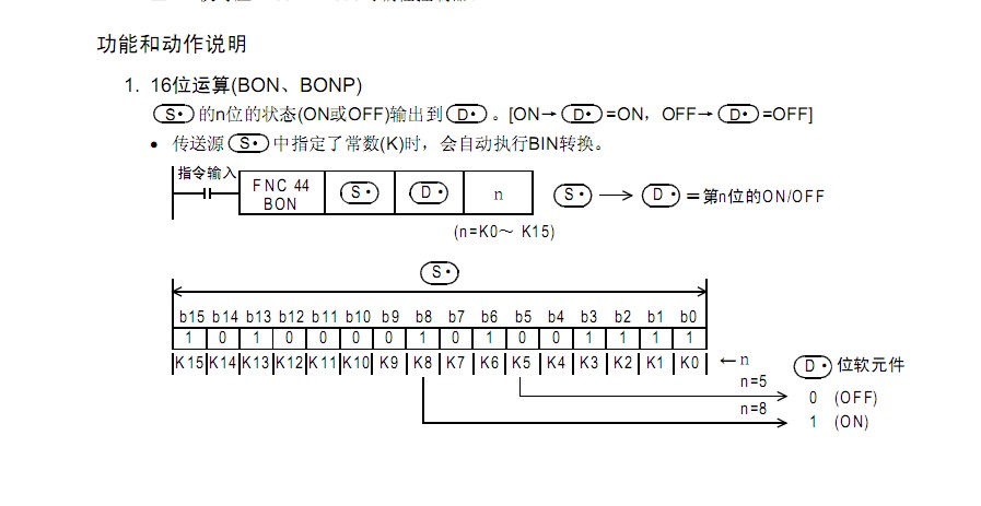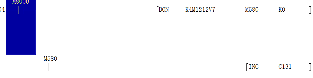 bon是on位判別指令,整條指令意思是判斷k4m1212的第0位也就是m1212是1/0,如果是1就把m80至1,通過inc加計(jì)數(shù)