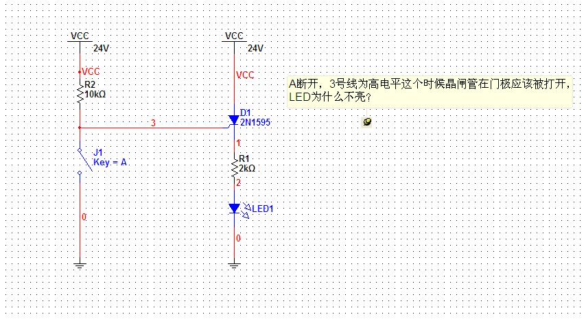 左邊:A開(kāi)關(guān)打開(kāi),晶閘管的門(mén)極為高電平,晶閘管導(dǎo)通,繼電器吸合,LED 也亮。