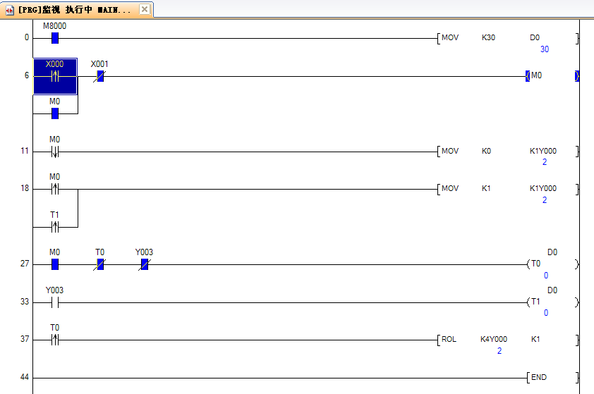 使用循環(huán)移位指令,移位到Y(jié)3(系統(tǒng)4只彩燈)時返回,D0設(shè)定亮燈時間。