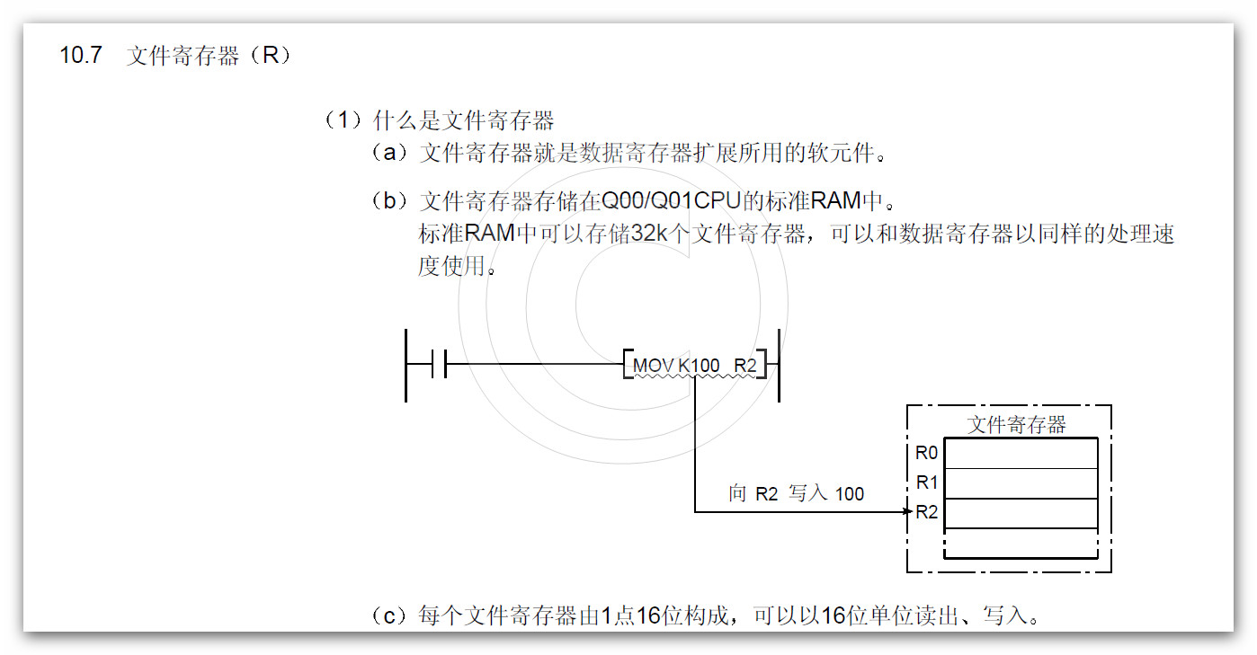 編程手冊(cè)第10.7章節(jié)好好看看就完全可以使用了,對(duì)于低階的諸如Q00等系列,在其使用手冊(cè)中對(duì)于軟元件R的描述中已經(jīng)明確用法,對(duì)于高階的型號(hào),其使用稍有不同,在其使用手冊(cè)上也已經(jīng)明確說明!。。。