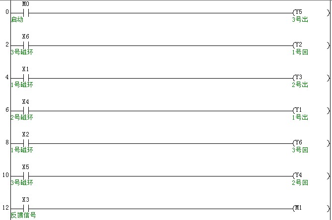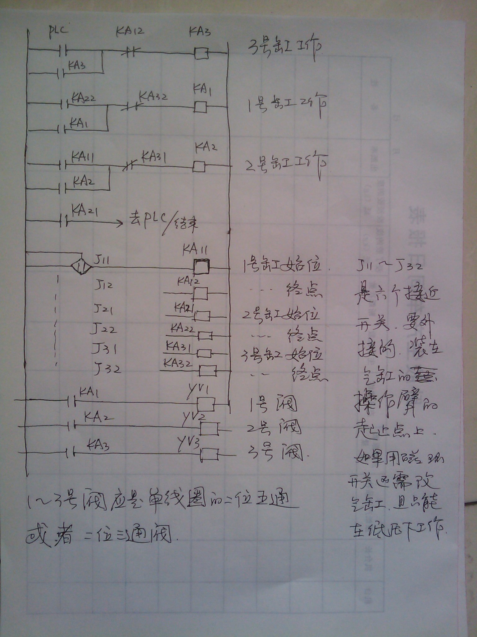 plc發(fā)出啟動(dòng)指令-----3號(hào)氣缸伸出,到底之后;-------1號(hào)氣缸收回,到底之后;-------2號(hào)氣缸伸出,到底之后;--------1號(hào)氣缸伸出,到底之后;-----3號(hào)氣缸收回,到底之后;----2號(hào)氣缸收回,到底之后;同時(shí)發(fā)完畢指令給plc(注:plc只控制啟動(dòng),不能用plc直接編程控制氣缸)。