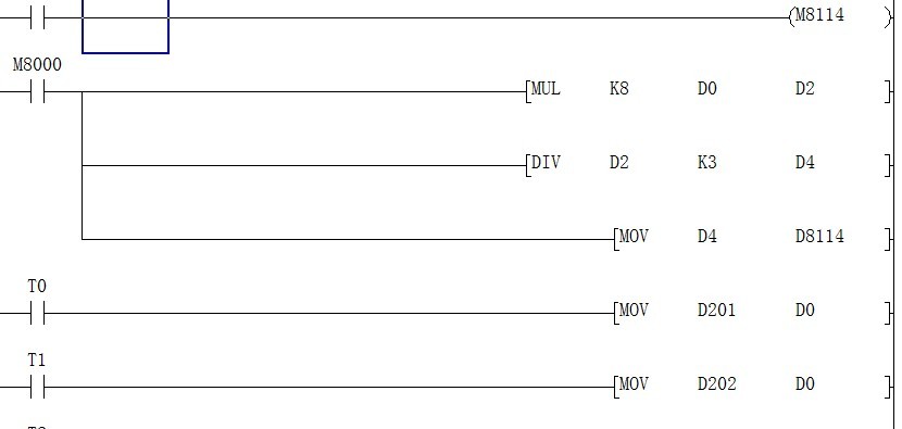 當(dāng)寫(xiě)入D201 D202數(shù)值時(shí) T0和T1分2個(gè)時(shí)斷分別把D201 D202數(shù)值傳給D0,D0的數(shù)值經(jīng)過(guò)運(yùn)算寫(xiě)到D4寄存器