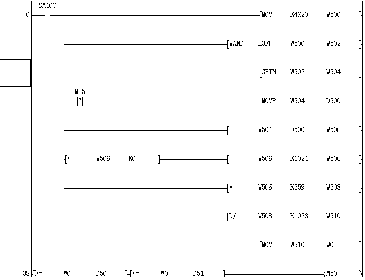 多謝了,我還以為像變頻器一樣的是通道地址,還有不明白的是為什么要加這條程序呢,傳送X20-X2F數(shù)值到W500中,我想應(yīng)該是QX40-S1讀取的格雷碼編碼器的值吧(不知對不對個人想法),再用GBIN指令轉(zhuǎn)成16位二進(jìn)制就行了啊,為什么還要加上十六進(jìn)制的3FF也就是十進(jìn)制的1023這個數(shù)呢,這段程序是別人給的可在觸摸屏上設(shè)置的多角度控制停機(jī)的PLC程序,還有< W506 K0就是大于0時,為什么加K1024,后面的*359,/1023啊,不知道是什么意思,只知道W0是現(xiàn)實(shí)角度,還望各位大神指點(diǎn)