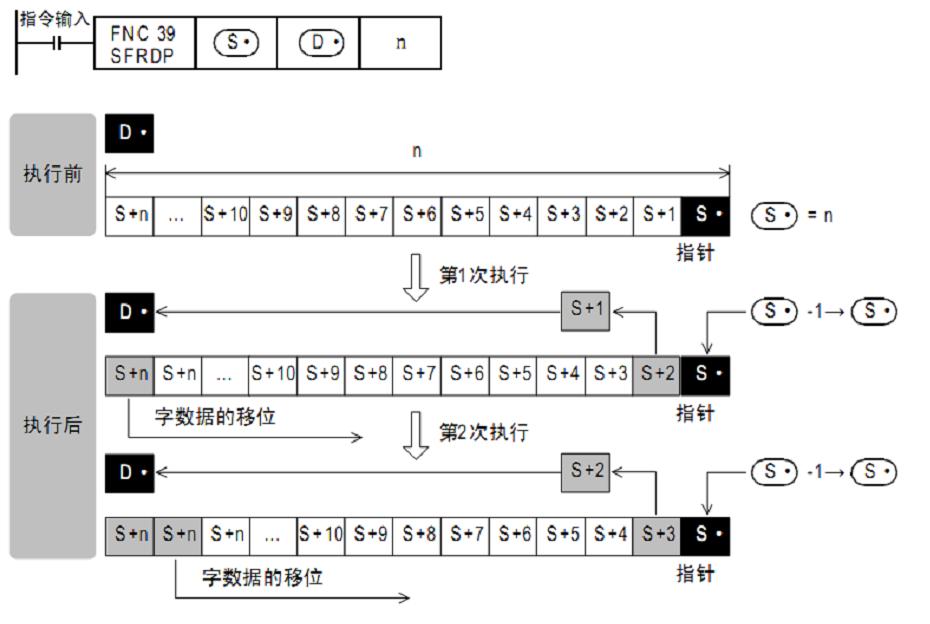 SFRD指令是先入先出控制用的數(shù)據(jù)讀出指令。該指令將SFWR指令儲(chǔ)存好的數(shù)據(jù)一次讀出。其執(zhí)行效果如下圖所示: