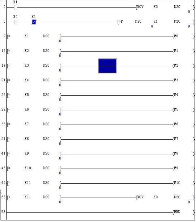 今小弟有一事相求各位:在Q系列中,我想用一個(gè)按鈕,如X0,按一下,M0打開(kāi),再按一下,M0關(guān)閉,M1打開(kāi)。再按一下,M0,M1關(guān)閉,M2打開(kāi)。一直到M10.