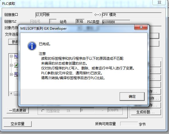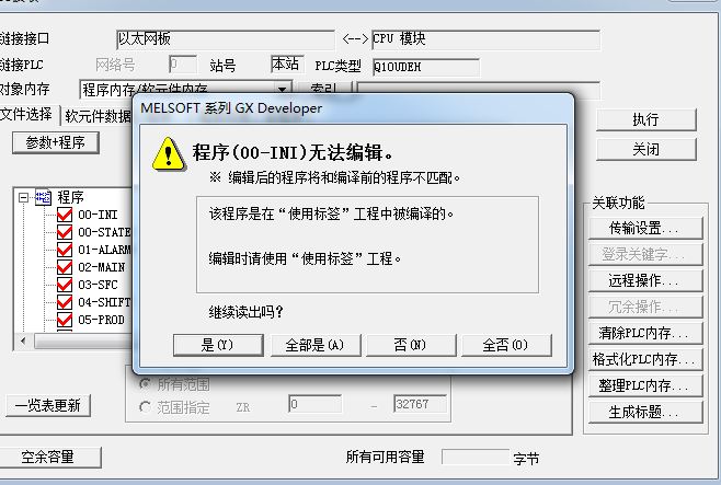 1、三菱Q系列PLC程序上載時 出現(xiàn)“ 程序無法編輯 編輯后的程序?qū)⒑途庉嬊暗某绦虿黄ヅ洹保绺郊䦂D2,在上載前,我打開的是以前備份的程序,但是這個程序是日本人給的,我看到他們進行備份的,用的是日文系統(tǒng)和軟件,上載沒有問題。但是我用他備份的程序進行上載備份時就出現(xiàn)這個報警,請問這是怎么回事,日文系統(tǒng)和中文系統(tǒng)上載程序有關(guān)系嗎?程序是使用日文編寫的標簽。
