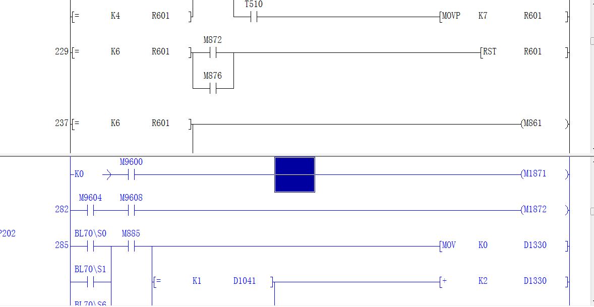 3、上載后的程序,發(fā)現(xiàn)部分程序打開如圖片7一樣,分為兩部分,下面的程序是藍色的,和上半部分的程序其實是一樣的,但是校驗的時候就是報警下半部分的程序沒有?這是為什么?