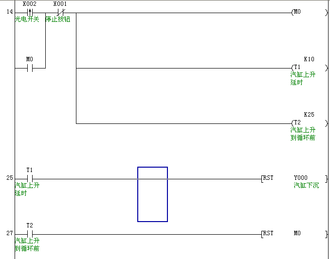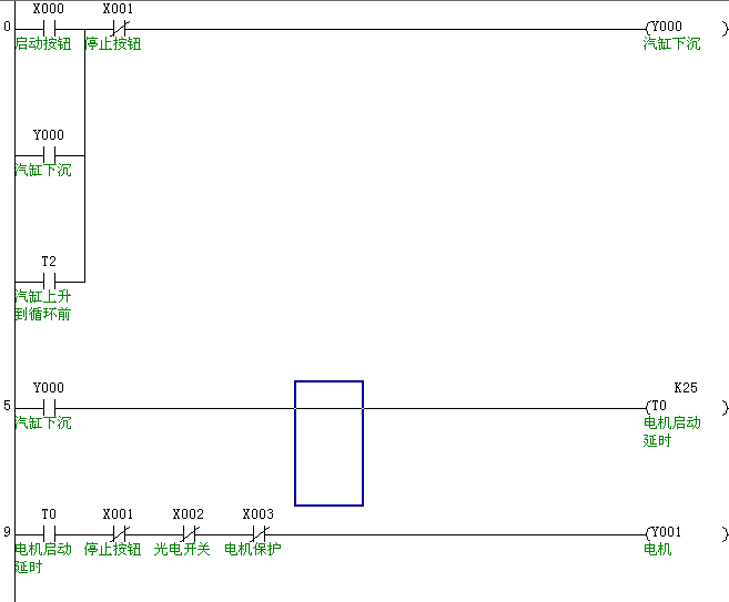 剛接觸三陵P(guān)LC f2n-48mr,現(xiàn)試做了一個(gè)程序,氣缸運(yùn)動(dòng)程序,主要?jiǎng)幼黜樞蚴牵合仁请姶砰y通電,氣缸下沉1.5s,停1s后,電機(jī)轉(zhuǎn)動(dòng),經(jīng)光電開(kāi)關(guān)檢測(cè),轉(zhuǎn)一圈停下來(lái)。停1s,電磁閥失電,氣缸上升,然后一直這樣循環(huán)。