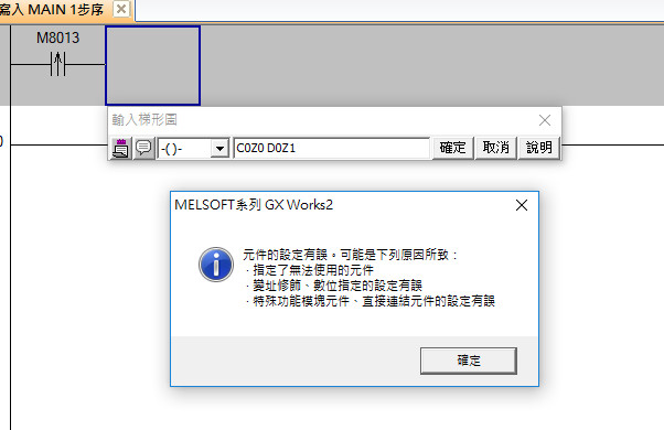 我用FX3G試,不行,用FX3U可以,用3U寫完程序後,改變PLC類型成3G又可以了。