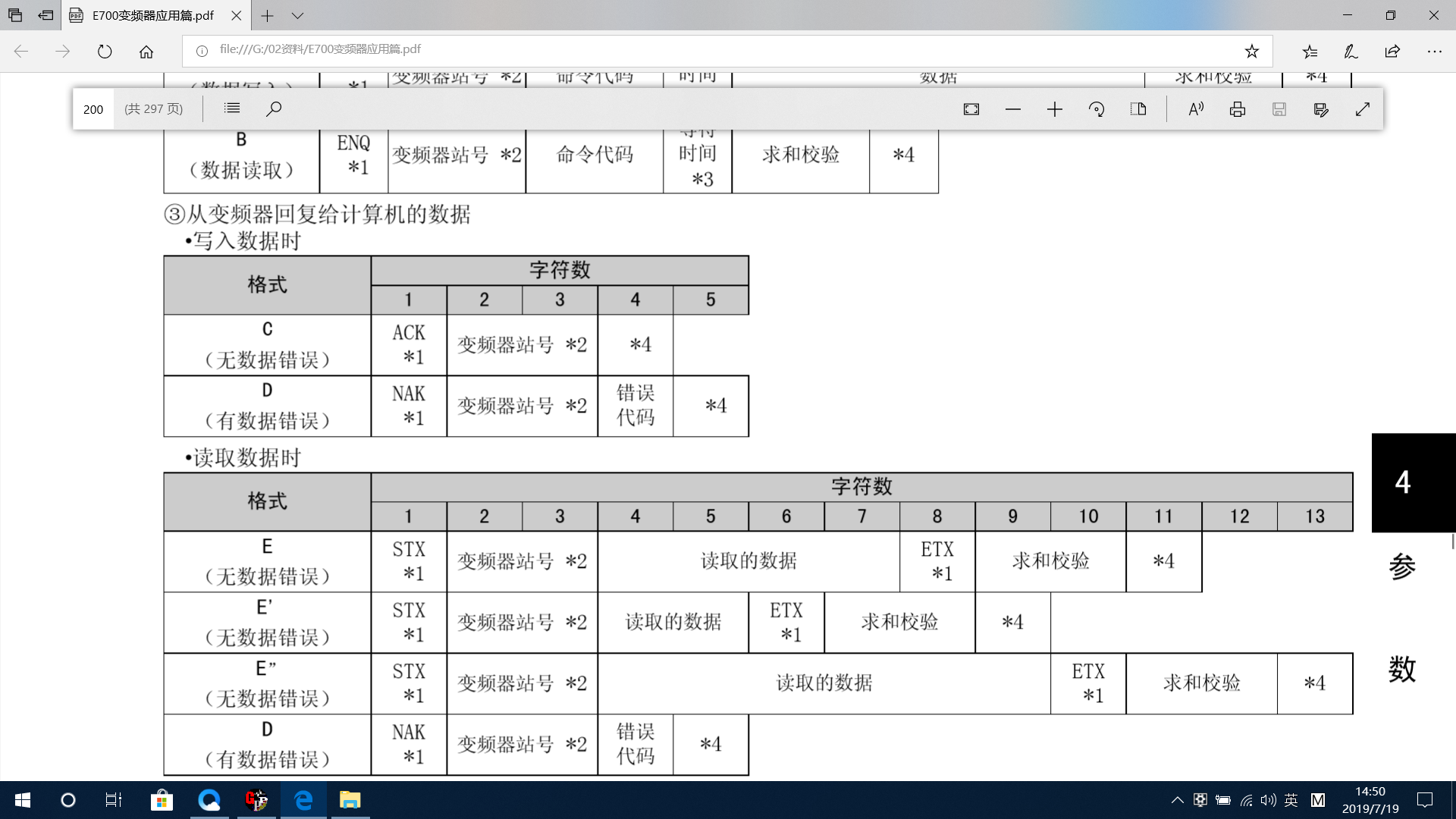 ENQ是三菱變頻器的專用協(xié)議通信指令的控制碼之一,命令代碼表示PLC命令變頻器干具體的事情(如啟動、停止、變向、變速,讀取轉(zhuǎn)速、電流數(shù)據(jù)等),等待時間表示,PLC發(fā)送通信數(shù)據(jù)給變頻器后,要求等多少時間后,變頻器發(fā)送應(yīng)答信號,這個等待時間由變頻器的參數(shù)Pr.123設(shè)定,可以設(shè)為無等待時間。這樣PLC就少發(fā)一個數(shù)據(jù)。