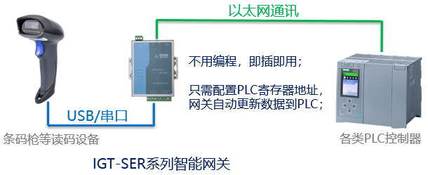 USB接口、232/485接口條碼槍通過IGT-SER接入PLC,不用編程,字符串直接寫入到PLC的寄存器: