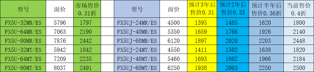 順利的話,半年后市場上可能會出現(xiàn)0.36折的FX5UJ價格。這個價格只是稍低于現(xiàn)在FX5U的價格,吸引力還不夠大。