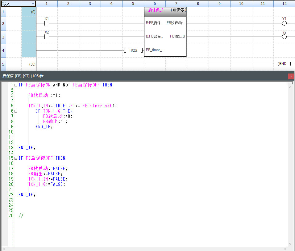 引用引用第1樓hefq于2020-04-14 12:00發(fā)表的 :SET( FB啟保停ON AND NOT FB啟保停OFF , tmp );RST( FB啟保停OFF , tmp );TON_1(IN:= tmp ,PT:= FB_timer_set ,Q=>FB輸出);FB軟啟動(dòng):= tmp AND NOT TON_1.Q ;