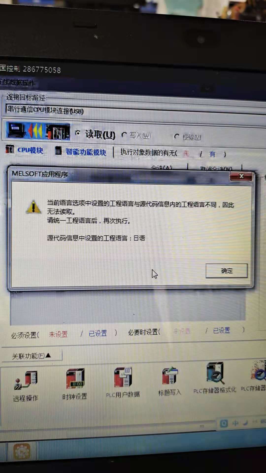 各位大佬 好久不見,最近遇到個(gè)問題。有一臺(tái)日本設(shè)備觸摸屏顯示運(yùn)動(dòng)CPU異常。我想讀取PLC程序,但是出現(xiàn)報(bào)警。不知誰(shuí)遇到過(guò)沒,是GXworks要日文的還是操作系統(tǒng)要日文的。詳見圖片