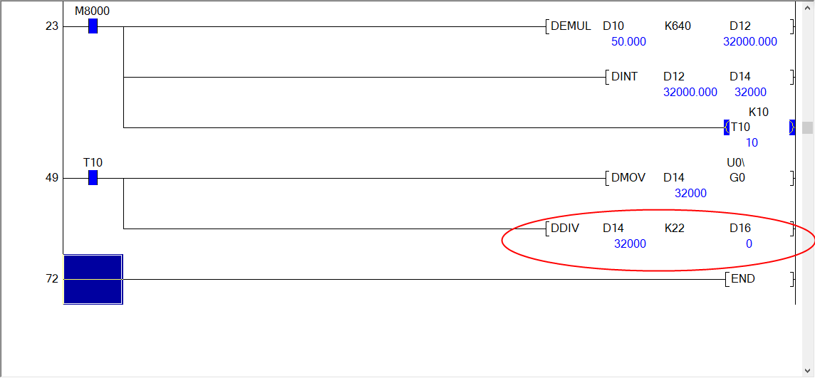 在除法下面再用個DMOV把D16傳到不用的地址中就可以了,被后面的程序改了。
