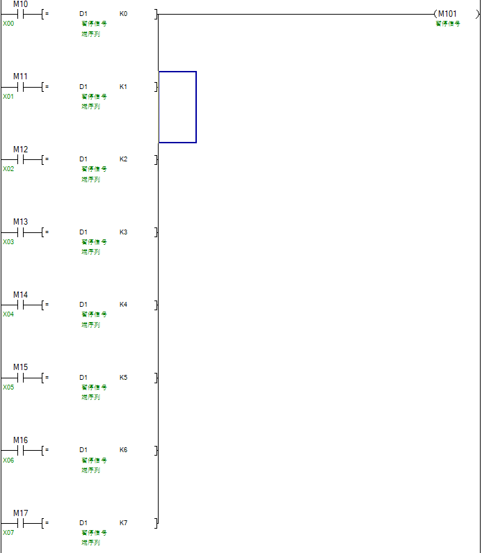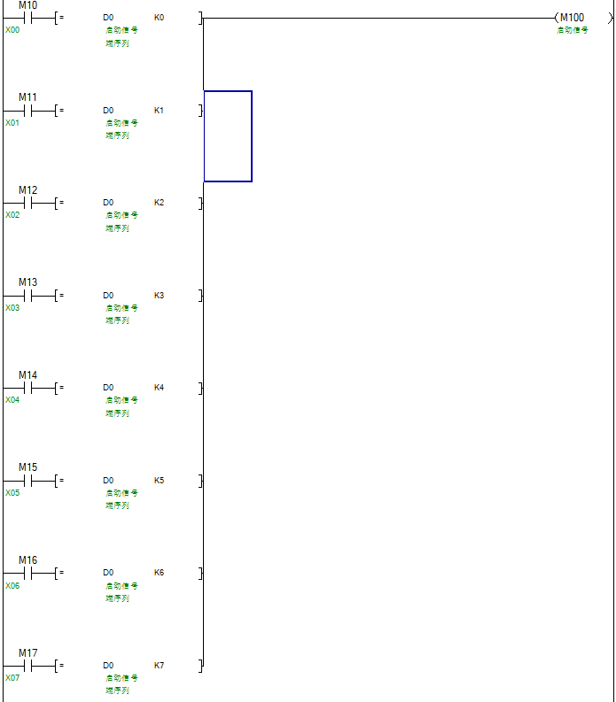 是這樣的,但我想的是,假如我<啟動(dòng)>可以從X0~X7中選其一,那我<停止>也可以從X0~X7中選其一,但是這時(shí)不能與<啟動(dòng)>選相同。以此下去