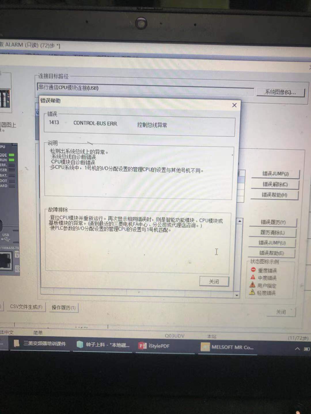三菱Q03UDV帶QD77SM2定位模塊、遠程模塊,模擬量輸入模塊各自一個,正常運行1H左右PLC報錯1413,總線異常,關(guān)電復(fù)位后又正常了,已經(jīng)更換了基板,CPU,定位模塊后還是報警,哪位大神知道什么原因?