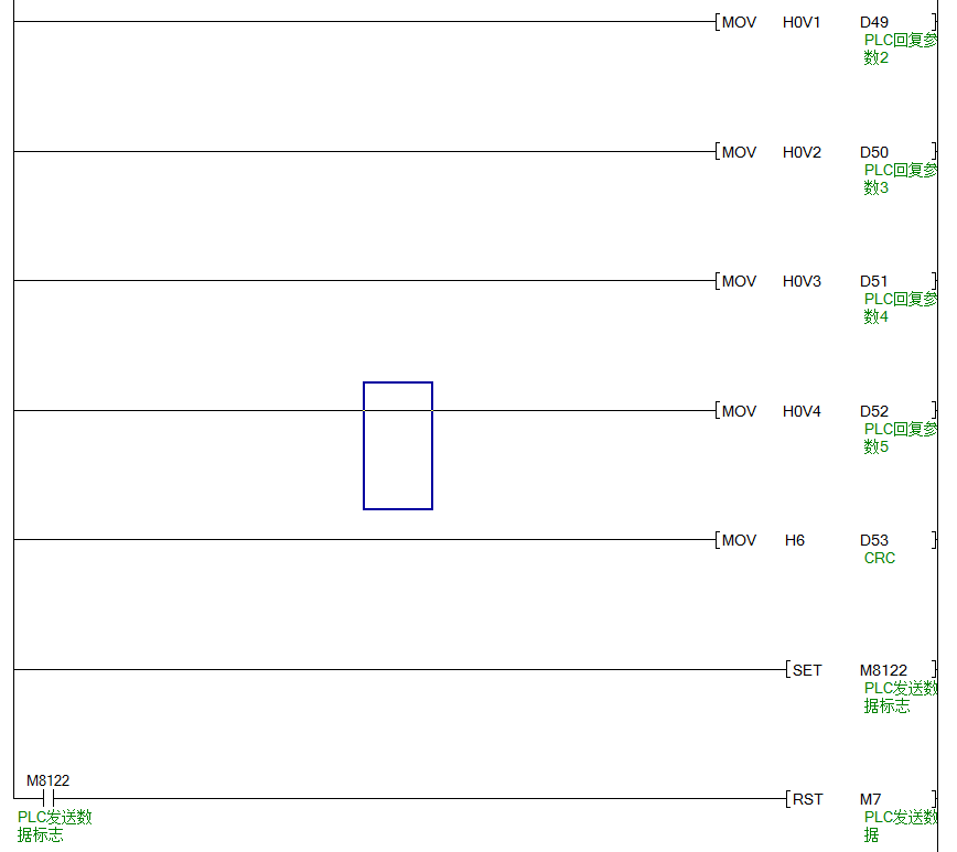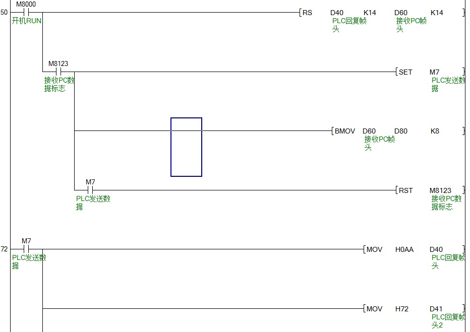 程序上面看不出什么問題,當M8123接收到指令時,立馬就啟動M8122回復(fù)PC,上面圖片上有程序就是接收和發(fā)送的,然后就是一直往復(fù)接收發(fā)送,沒有理由程序還有什么其他延時不回復(fù)的情況啊?
