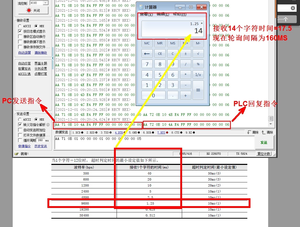 請問如圖所示,PLC發(fā)送14個字符時間為17.5MS,那么接收PC14個字符是不是按同理17.5MS計算,可是為什輪詢間隔都設(shè)成160MS了為什么PLC還是會偶而沒有回復(fù)呢?另外PC做了一個判斷、當收不到PLC的回復(fù)時PC就不在輪詢了停在當前狀態(tài)。