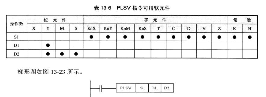 由于選用FX2N+定位模塊價格高些,最近買了個FX3U的PLC,想直接用一個PLC來實現(xiàn)我上述的功能,降低價格。遇到了一個困惑,在FX3U的定位控制篇手冊的時候,有一個可變速脈沖輸出指令PLSV,用于在脈沖輸出的同時改變脈沖頻率,從而改變伺服電機(jī)轉(zhuǎn)速,實現(xiàn)多段速控制,但沒有像定位模塊中一樣的可以預(yù)先設(shè)置輸出脈沖數(shù)量的軟元件,不能用于精確定位。如下圖:
