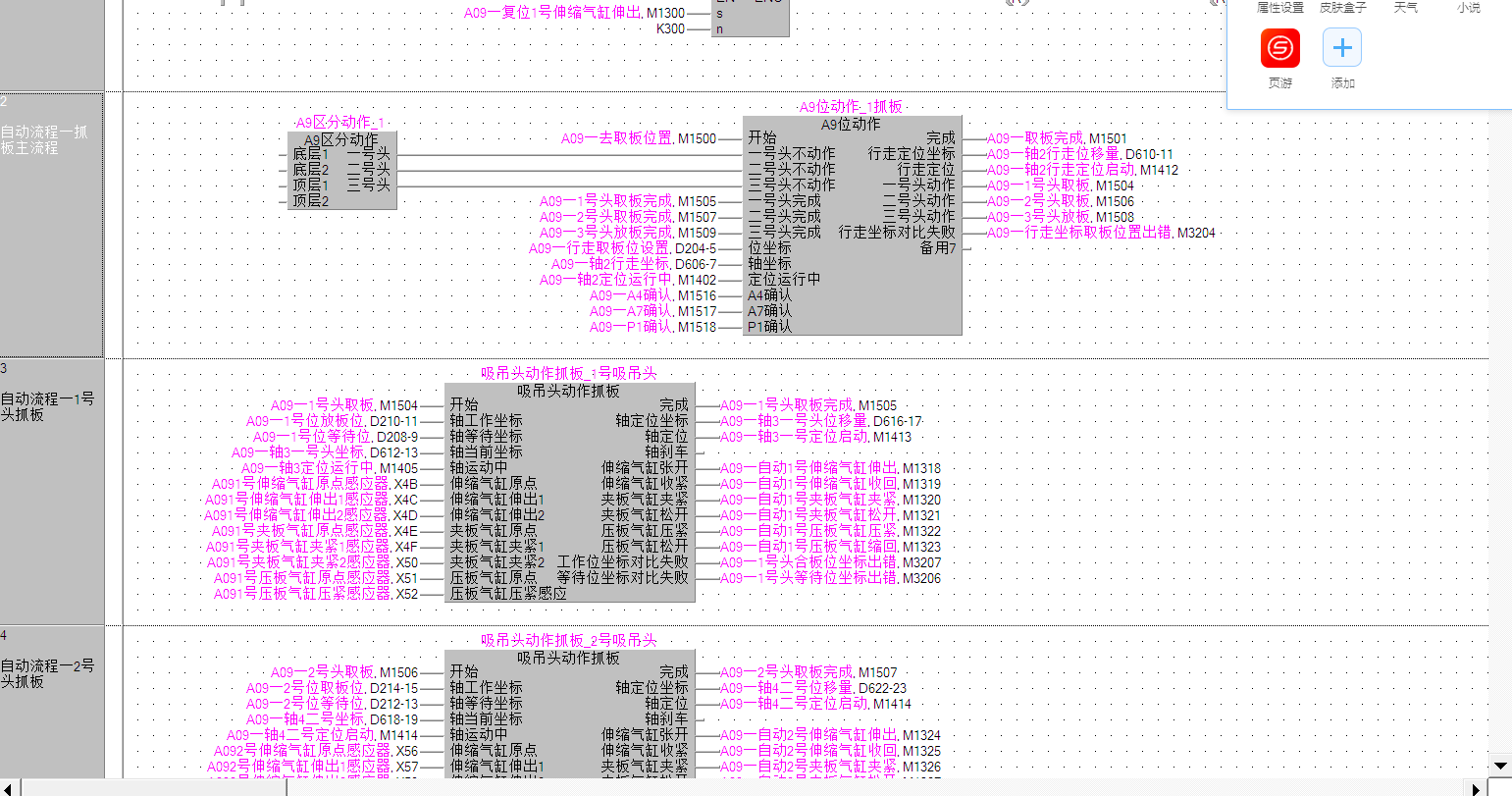 其實(shí)畫線這些還好,用自動(dòng)畫線連接,找塊用指令輸入,主要還是邏輯感比用梯形圖好,之前我已經(jīng)用梯形圖寫了四五臺(tái),感覺寫交互的時(shí)候好亂