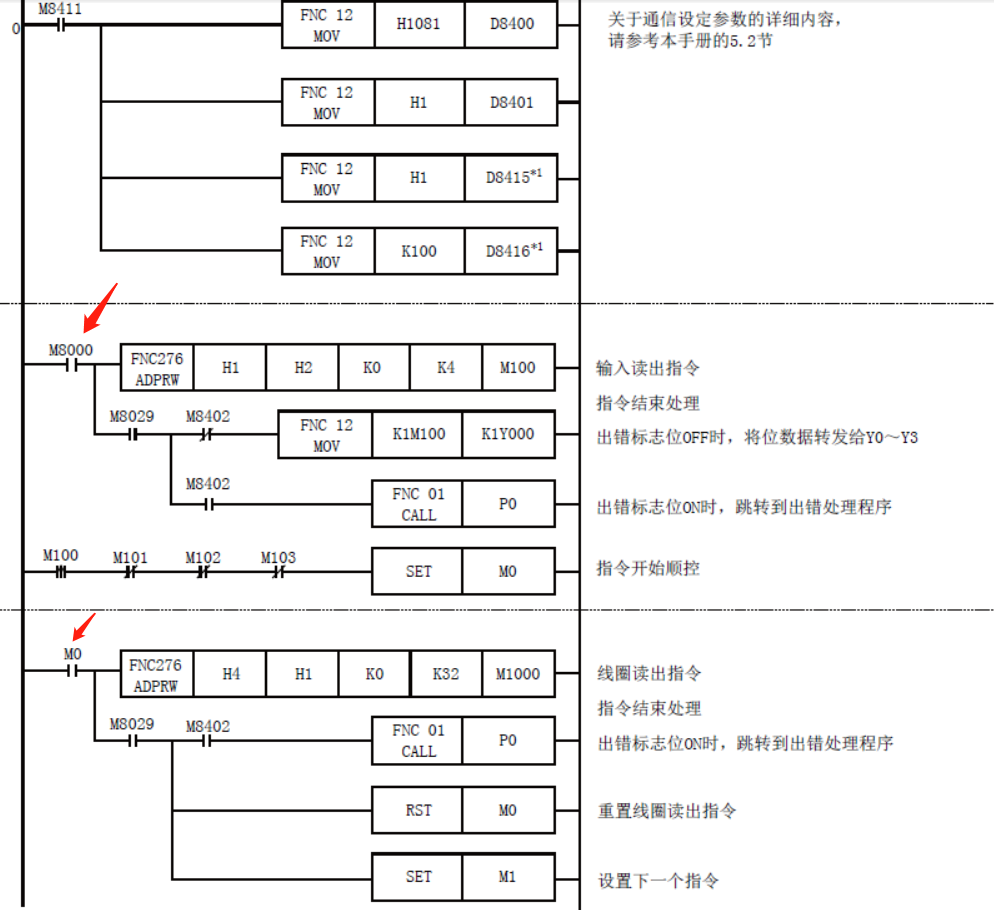 1) 在MODBUS主站中使用ADPRW指令時(shí),請(qǐng)將驅(qū)動(dòng)接點(diǎn)保持ON狀態(tài)直到ADPRW指令結(jié)束(M8029為ON)。