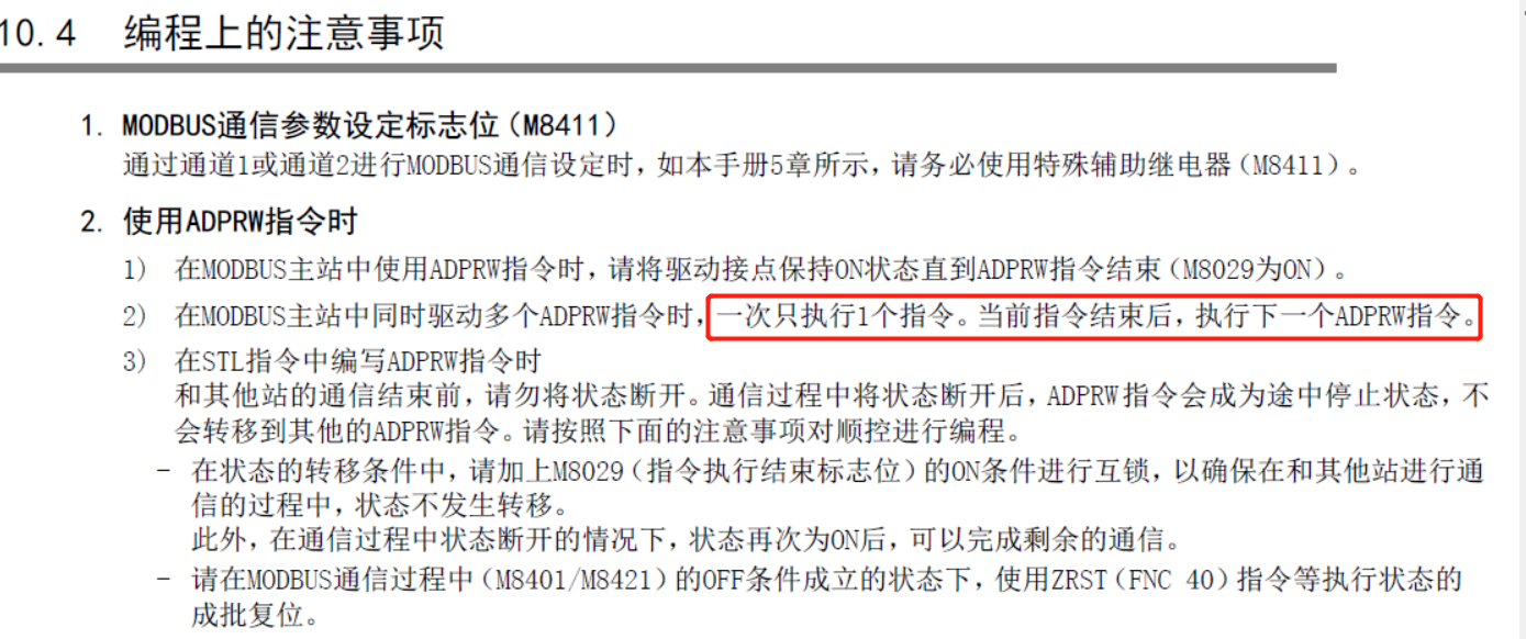 2) 在MODBUS主站中同時(shí)驅(qū)動(dòng)多個(gè)ADPRW指令時(shí),一次只執(zhí)行1個(gè)指令。當(dāng)前指令結(jié)束后,執(zhí)行下一個(gè)ADPRW指令。