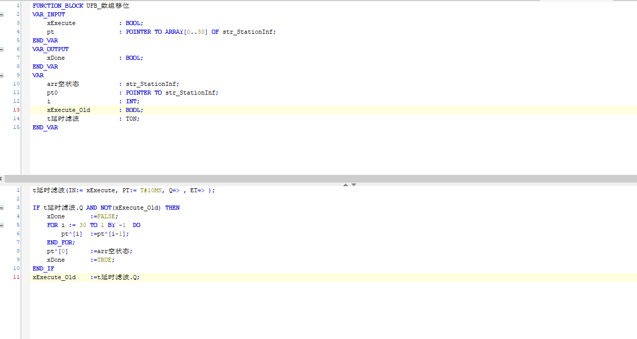 引用引用第1樓kyy80于2023-03-23 10:34發(fā)表的 :ELSIF NOT I_B_修改 AND NOT I_B_刪除 AND I_B_插入 THEN FOR I_TEMP:=49 TO (I_I_條目號(hào)+1) BY -1 DO IO_AR_數(shù)組.配方[I_TEMP] :=IO_AR_數(shù)組.配方[I_TEMP-1]; END_FOR; IO_AR_數(shù)組.配方[I_TEMP] :=I_D_數(shù)據(jù);.......