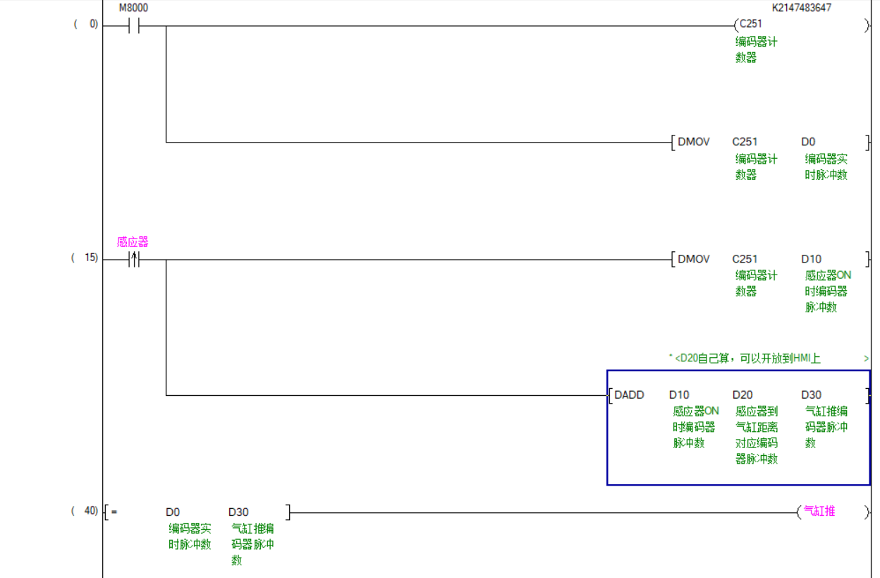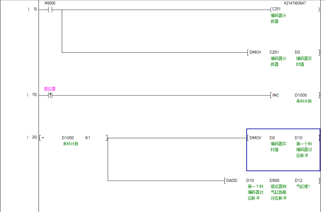 引用引用樓主aqqzz@qq.com于2023-08-24 15:03發(fā)表的 求助編程思維,大佬幫忙想想思路 :求編程思路,如果兩個物料離的比較近,感應(yīng)器感應(yīng)到第一個物料開始編碼器計(jì)數(shù),還沒到氣缸推出的位置感應(yīng)器感應(yīng)到第二個物料怎么辦?編碼器又不能復(fù)位