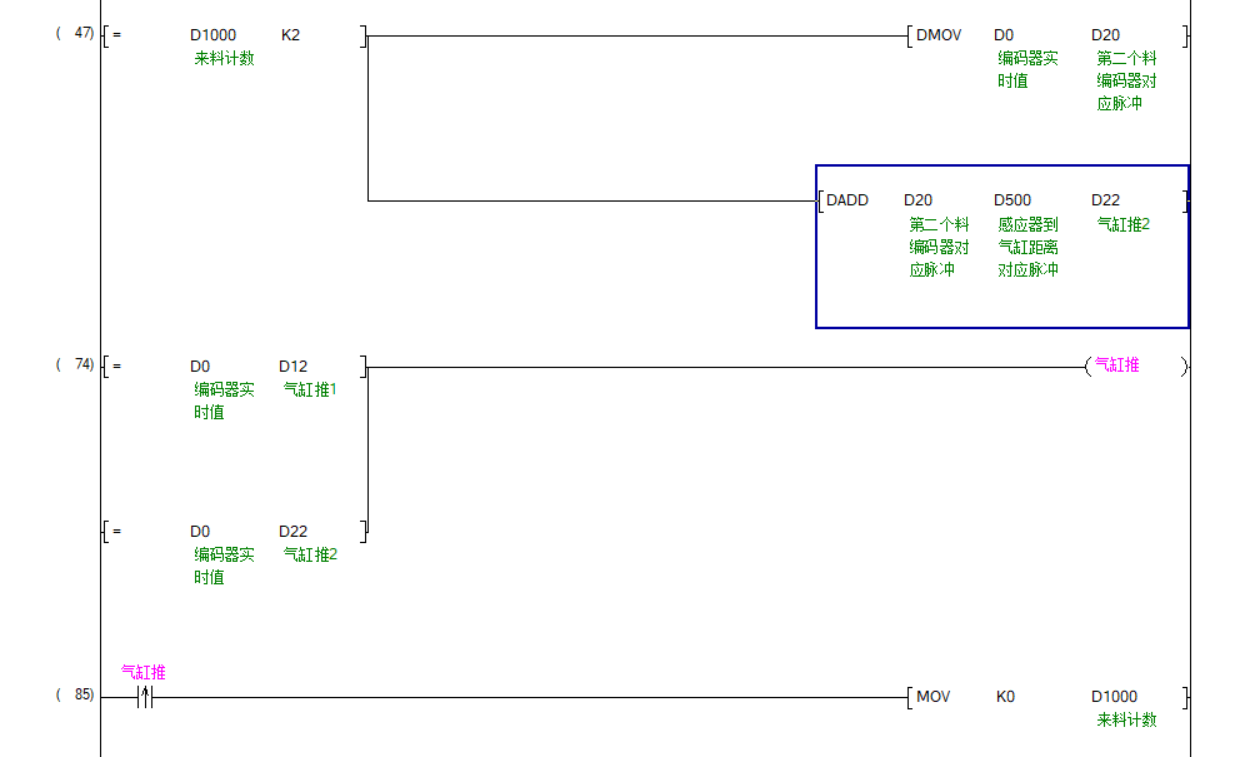 引用引用第10樓aqqzz@qq.com于2023-08-24 17:04發(fā)表的 :首先感謝你的回復(fù),你這第一個問題是當(dāng)?shù)谝粋氣缸推的時候就把物料計(jì)數(shù)清零了,第二個物料就不會推了