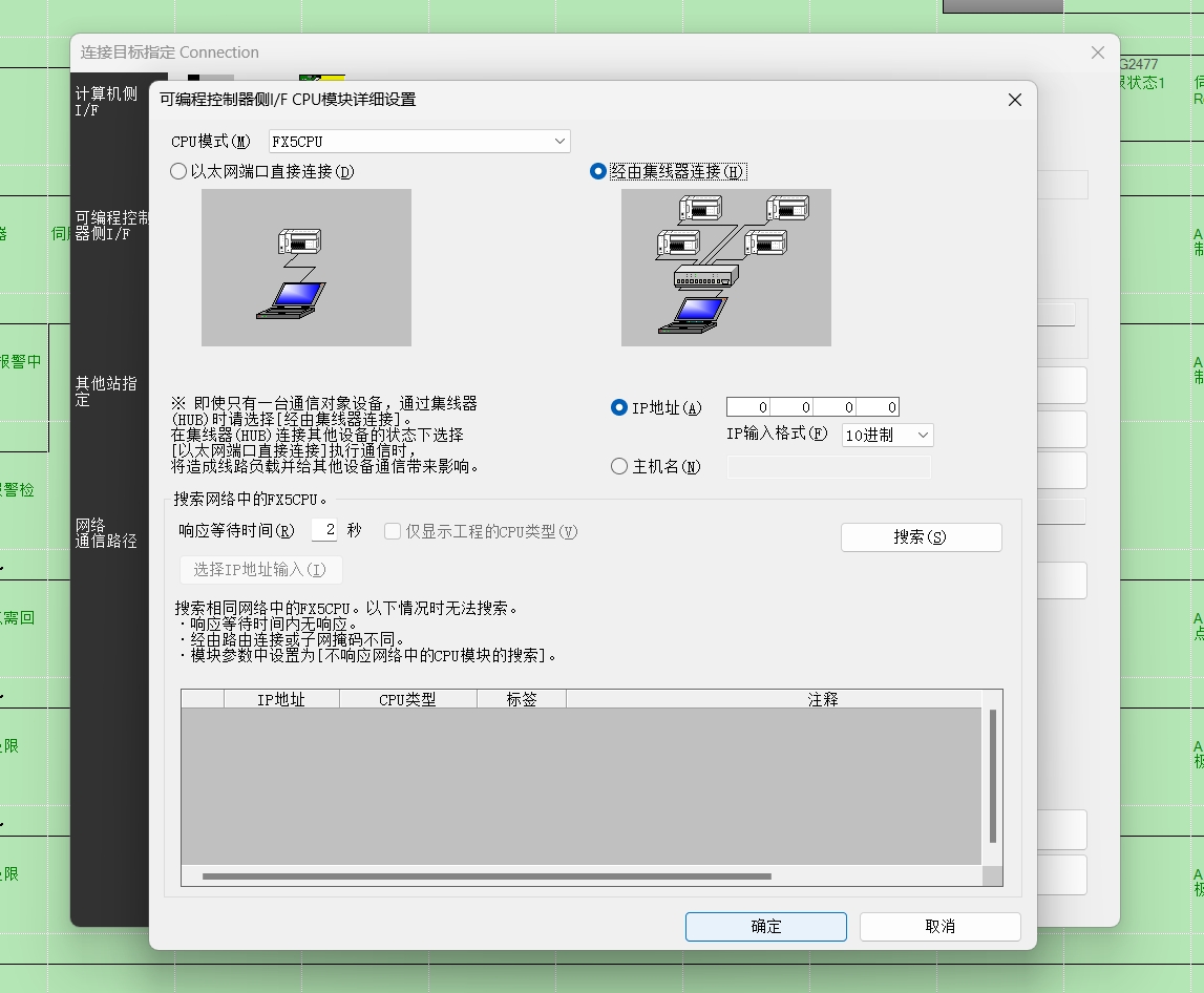 然后雙擊CPU模塊選擇經(jīng)由集線器,手動輸入IP或者自動搜索。