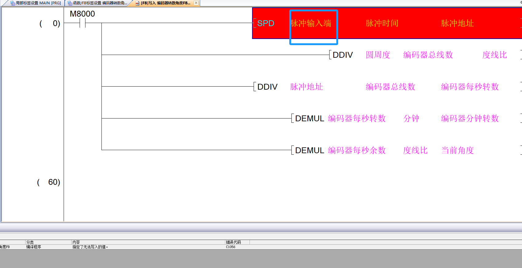 各位老師,我想制作一個編碼器轉(zhuǎn)數(shù)角度的FB庫,最后編譯提示SPD指定了無法寫入的值,估計是輸入端子X1或X0作為固定量非變量無法編譯。有么有什么辦法可以替換呢?謝謝!