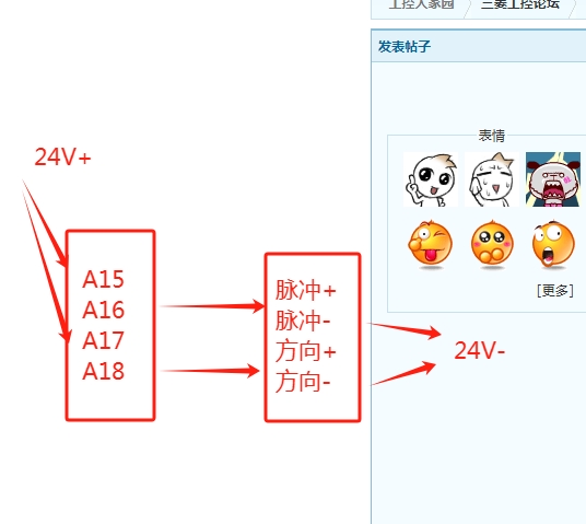 測試出來了,A15-A18是PLC電源直接給的5V,不需要外部電源搞在一起,也就是A15到步進(jìn)脈沖正,然后脈沖負(fù)回到A16就行。