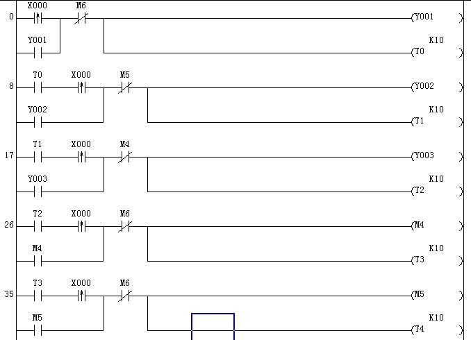 LZ應(yīng)該沒有實際模擬過吧,當(dāng)啟動逆序停止時T4,M6置位ON。M5,T4為OFF,所以無論按幾次都只能控制M5的啟動,停止,個人認(rèn)為程序不夠完善,待改進(jìn)。