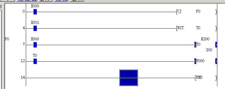 因為X0一直處于接通狀態(tài),所以跳轉(zhuǎn)一直執(zhí)行,程序不會執(zhí)行LD X1  OUT T0 K200這一步。