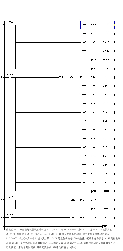 各位老大。fx1n和愛(ài)默生ev1000(原來(lái)華為td1000)的485通訊問(wèn)題,是自由協(xié)議的不是modbus協(xié)議的。我變了個(gè)程序想查看變頻器運(yùn)行頻率,結(jié)果不能正常通訊,不知啥原因,請(qǐng)各位看看,波特率是是9600,8-n-1。用fx1n-485bd,所以d8120是0f81.7e是幀頭在d8124,0d是幀尾在d8125,超時(shí)是10ms在d8129,d150是變頻器的頻率,他的主機(jī)命令協(xié)議格式是010100000182,其中第一個(gè)01是地址,第二個(gè)01是上位機(jī)命令,0000是輔助索引和命令索引,0182是校驗(yàn)和,d108到d111是從機(jī)響應(yīng)返回的數(shù)據(jù),用hex把它變成16進(jìn)制存在d150,這樣讀的就是變頻器的頻率了,可是我讀出來(lái)的值是固定的是386,不知何故。我手動(dòng)改變變頻器的頻率d150的值也不變化