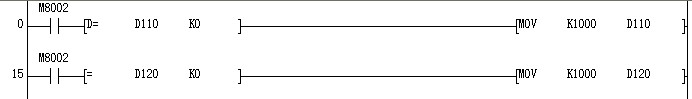 當(dāng)D110=0;D111=1或其他非0值;D120=0;D121=1或其他非0值時,第一條指令條件不滿足,第二條滿足。