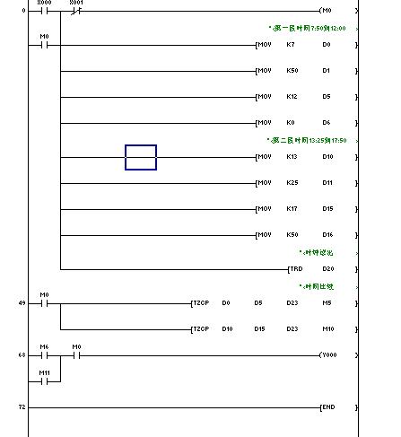各位高手,我想做個定時(shí)控制程序,如何實(shí)現(xiàn)Y0早上7:50開機(jī),中午12:00關(guān)機(jī),下午13:25開機(jī),下午17:50關(guān)機(jī),謝謝大家賜教(最好能給個程序圖)