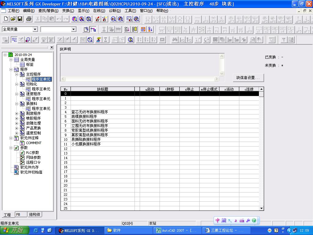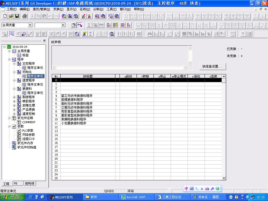 我現(xiàn)在用GX 8.86G編程,用的是Q系列CPU,在用SFC語(yǔ)言編程,在編寫多個(gè)程序的時(shí)候,在我命名了一個(gè)程序中的一個(gè)塊的"塊標(biāo)題",在其他程序相同塊的"塊標(biāo)題" 也被命名相同的塊標(biāo)題,這個(gè)如何解決呢? 是到底改什么參數(shù)才可以能夠不同程序的塊標(biāo)題是不相同的呢?我在步的注釋就可以把 "BL"軟元件的注釋改成"各元件的注釋",就可以解決,可就是不知道"塊標(biāo)題"有沒有對(duì)應(yīng)的軟元件,大家有沒有遇過這樣的問題呢?