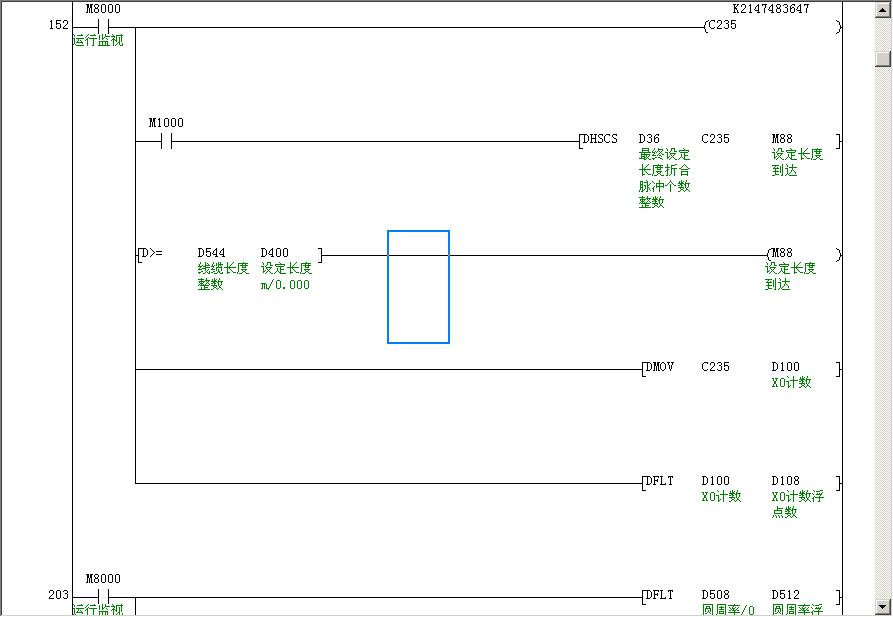 用DHSCS這個(gè)指令是不受掃描影響的, 使用2相2計(jì)數(shù)的話,A、B相就是指旋轉(zhuǎn)編碼器的A、B相吧?如使用C251的話,X0就是A相,X1就是B相,那么A、B相對(duì)應(yīng)的計(jì)算數(shù)據(jù)存放在C251高速計(jì)數(shù)器里。 特殊功能指令是不支持摸擬仿真。 |