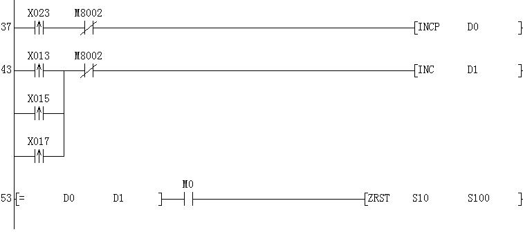 引用引用第3樓jdq65981于2008-10-26 08:33發(fā)表的 :我來解釋一下吧,首先第一行指令是:當(dāng)X23閉合且M8002為0是D0加1 (只執(zhí)行一次) 第二行是:當(dāng)X13或X15 或X17為1時(shí)且M8002為0時(shí)D1加1 (程序執(zhí)行1次就+1沒次加1) 第三行是:當(dāng)D0=D1時(shí)切M0也為1時(shí)S10到S100全部復(fù)位