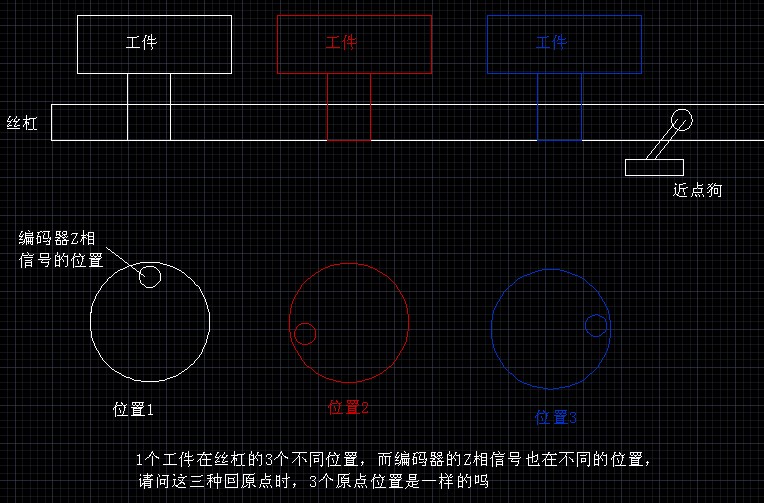 1個工件在絲杠的3個不同位置,而編碼器的Z相信號也在不同的位置,請問這三種回原點時,3個原點位置是一樣的嗎