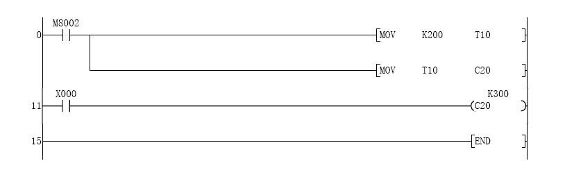 這是你的程序要求達(dá)到的控制目的,第一個(gè)掃描周期時(shí)當(dāng)X0為OFF時(shí),C20是K200,第一個(gè)掃描周期后X0為ON時(shí)c20是K300 |