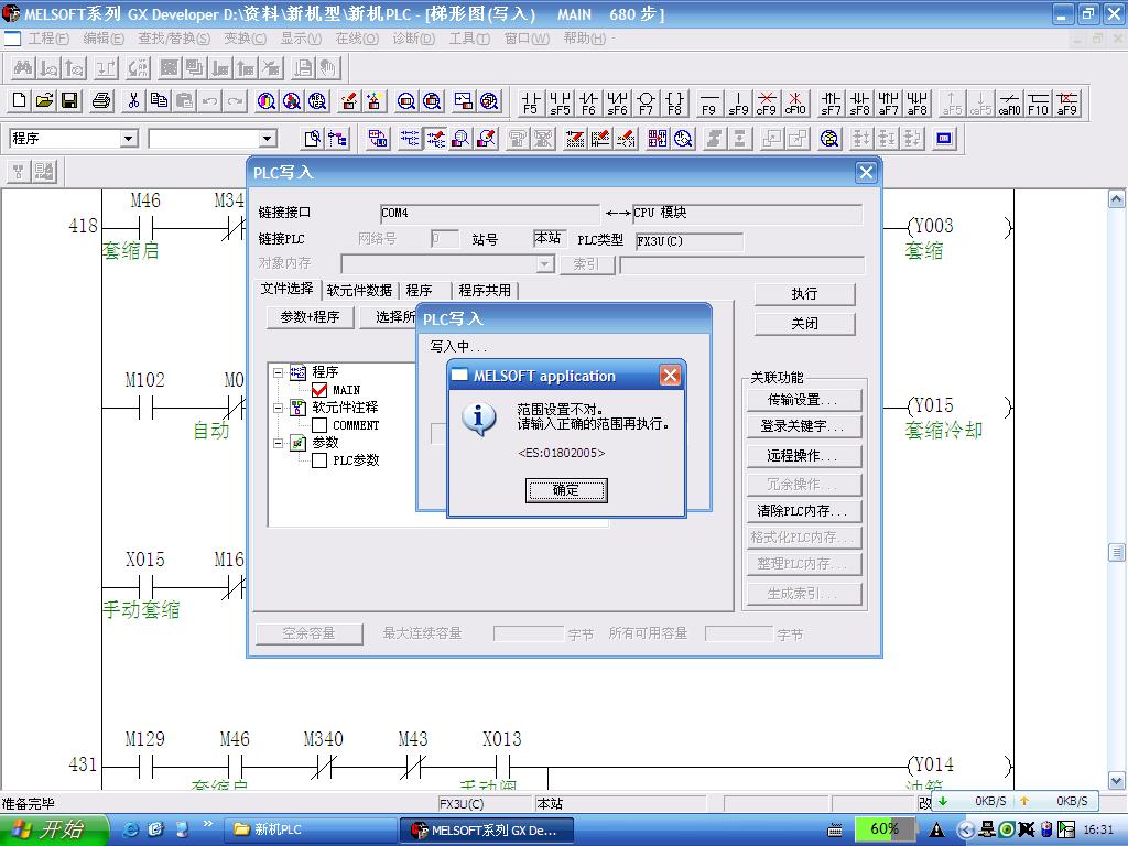我用的是三菱FX3U    在輸入程序到PLC 時(shí)   ,它顯示是我的設(shè)置范圍不正確。程序輸入不了,我不清楚這是什么原因。求高人指點(diǎn)