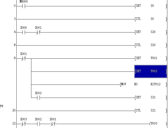 樓主第一句就錯(cuò)了,改成M8002,跳轉(zhuǎn)的話直接set s21就行了,還有,最好每一個(gè)狀態(tài)都是直輸出,不要再有條件輸出,條件只用來(lái)轉(zhuǎn)移狀態(tài)。