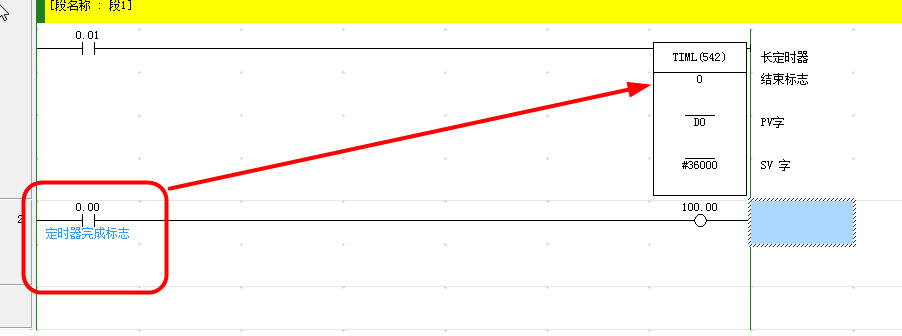 TIML沒有定時(shí)器號(hào),因此只是設(shè)定結(jié)束標(biāo)志,如圖中的CIO 0,那么其最低位就是結(jié)束標(biāo)志,也就是定時(shí)器的觸發(fā)標(biāo)志位,如果使用普通定時(shí)器指令,那么這個(gè)標(biāo)志就是定時(shí)器觸發(fā)位。