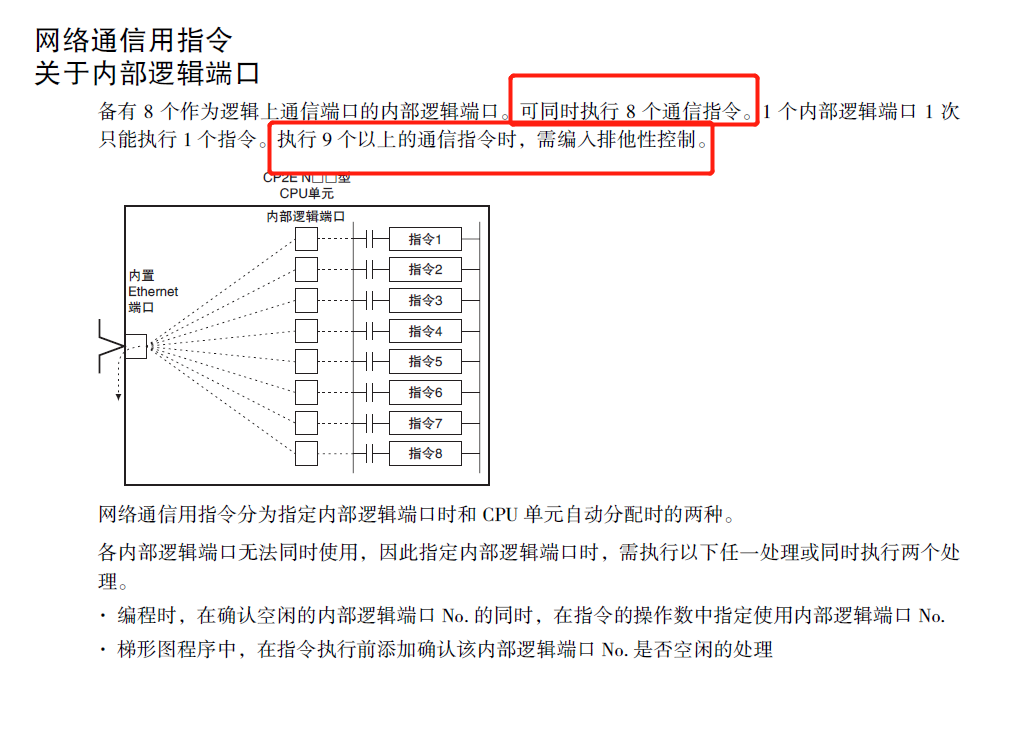 CP2E-N手冊(cè)說(shuō)FINS通信中RECV和SEND指令可以同時(shí)使用8個(gè)指令,PLC備有8 個(gè)作為邏輯上通信端口的內(nèi)部邏輯端口?赏瑫r(shí)執(zhí)行8 個(gè)通信指令。但是實(shí)際使用時(shí)有問(wèn)題