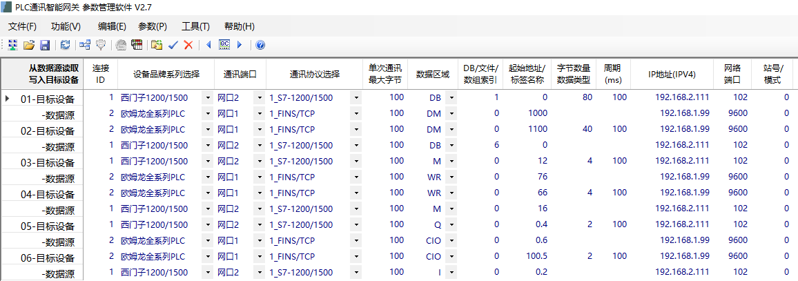 PLC之間通訊可以用IGT-DSER來實(shí)現(xiàn),支持三菱、歐姆龍、西門子等多種不同品牌的PLC之間通訊; PLC內(nèi)不用編程的,配置也比較簡單,以下是歐姆龍跟西門子 通訊的案列: ![]() 任務(wù)1:從歐姆龍PLC讀取DM1000開始的40個(gè)字,寫入到西門子PLC的DB1.DBB0開始的80個(gè)字節(jié); 任務(wù)2:從西門子PLC讀取DB6.DBB0開始的40字節(jié),寫入到歐姆龍PLC的DM1100開始的20個(gè)字; 任務(wù)3:從歐姆龍PLC讀取W76、W77,2個(gè)字依次寫入到西門子PLC的MB12、MB13、MB14、MB15; 任務(wù)4:從西門子PLC讀取MB16~MB19,4字節(jié)寫入到歐姆龍PLC的W66~W67; 任務(wù)5:從歐姆龍PLC讀取CIO 0.6, 1個(gè)BOOL位寫入到西門子PLC的QX0.4; 任務(wù)6:從西門子PLC讀取IX0.2,1個(gè)BOOL位寫入到歐姆龍PLC的CIO100.5; 其它品牌的通訊案例: ![]() |