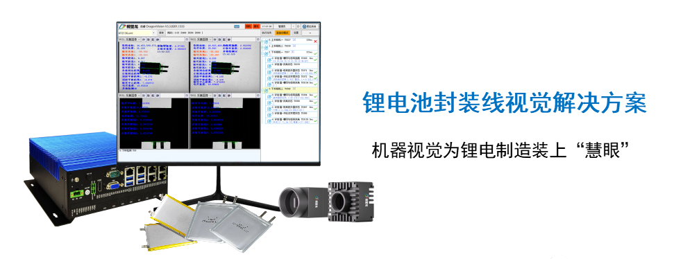 視覺龍通過(guò)不斷深入研究軟包電池封裝工藝,針對(duì)性地推出了整套機(jī)器視覺解決方案。方案采用“龍睿AIoT平臺(tái)”的強(qiáng)大算法、特殊的光學(xué)方案和高速高分辨率相機(jī),可以快速精準(zhǔn)定位電芯,電芯、極耳等尺寸測(cè)量,以及極耳膠破損和異物檢測(cè)。最大視野85mm的同時(shí),測(cè)量靜態(tài)精度高達(dá)0.015mm。