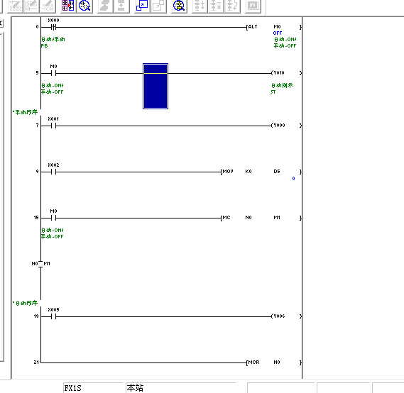 假設(shè)X0是手自動開關(guān),那么X0=1為自動;X0=0為手動。 比如自動時Y0輸出,手動時Y1輸出。 ld x0 out y0 ldi x0 out y1 |